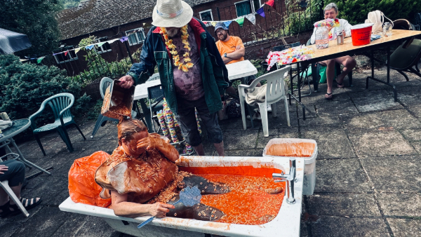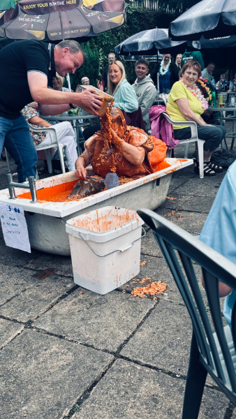 The Six Bells team were keen to raise as much money as they could, so for a £3.00 donation, supporters could pour a bucket of beans over Jeanette’s head.