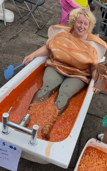 Once it was dipping time, Jeanette, kept her sense of humour, even wearing a toast fancy dress outfit.