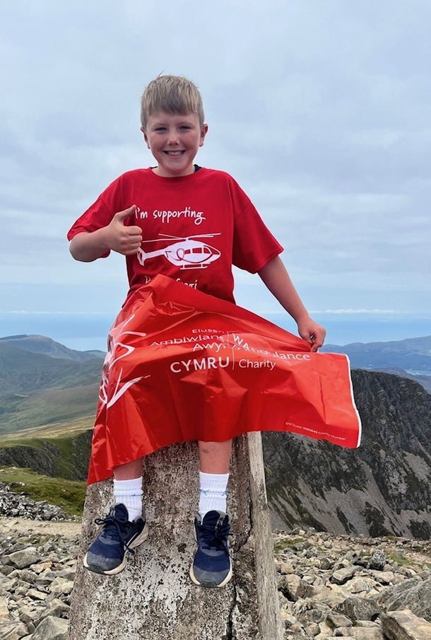 Ten-year-old Aron Lloyd, from Dolgellau, has raised an incredible £1,100 for the lifesaving Charity by walking, cycling and running over 100-miles – the distance from his home to Ysbyty Gwynedd twice.